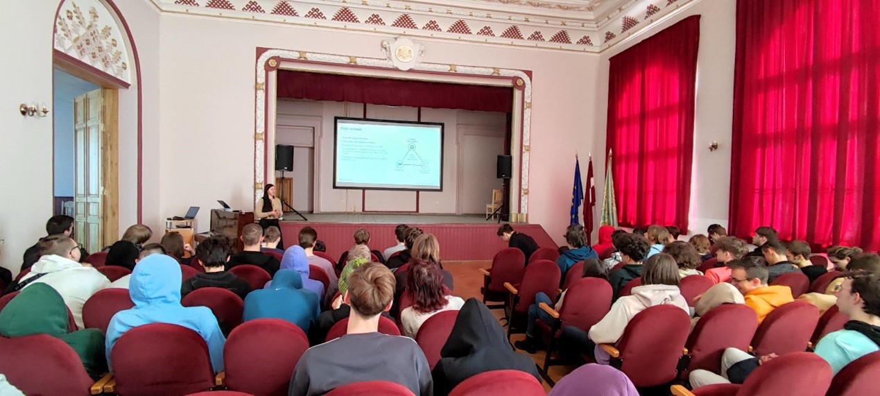 2023.gada 1.martā Datorikas nodaļas 2.kursa grupām DP2-1, DP2-2, DP2-3, DP2-4 Sistēmu programmēšanas skolotāja Alekša Šteinburga stundas norisinājās tehnikuma aktu zālē, Accenture Baltics Microsoft grupas vieslekcijā – “What business expects from Junior developer” (Ko uzņēmums sagaida no jaunā darbinieka?). Vieslekciju vadīja Renate Tomilova.