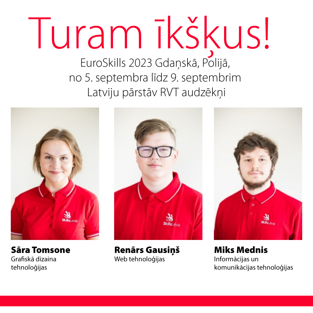 Īpaši esam lepni par to, ka Latvijas komandā ir 3 dalībnieki, kuri pārstāv Rīgas Valsts tehnikumu – Sāra Tomsone demonstrēs savas prasmes grafiskā dizaina tehnoloģijās, Renārs Gausiņš piedalās Web tehnoloģiju lietpratēju konkursos un mūsu tehnikuma absolvents Miks Mednis pārbaudīs savus spēkus informācijas un komunikācijas tehnoloģiju jomā. Turēsim īkšķus par savējiem! Lai veicas!