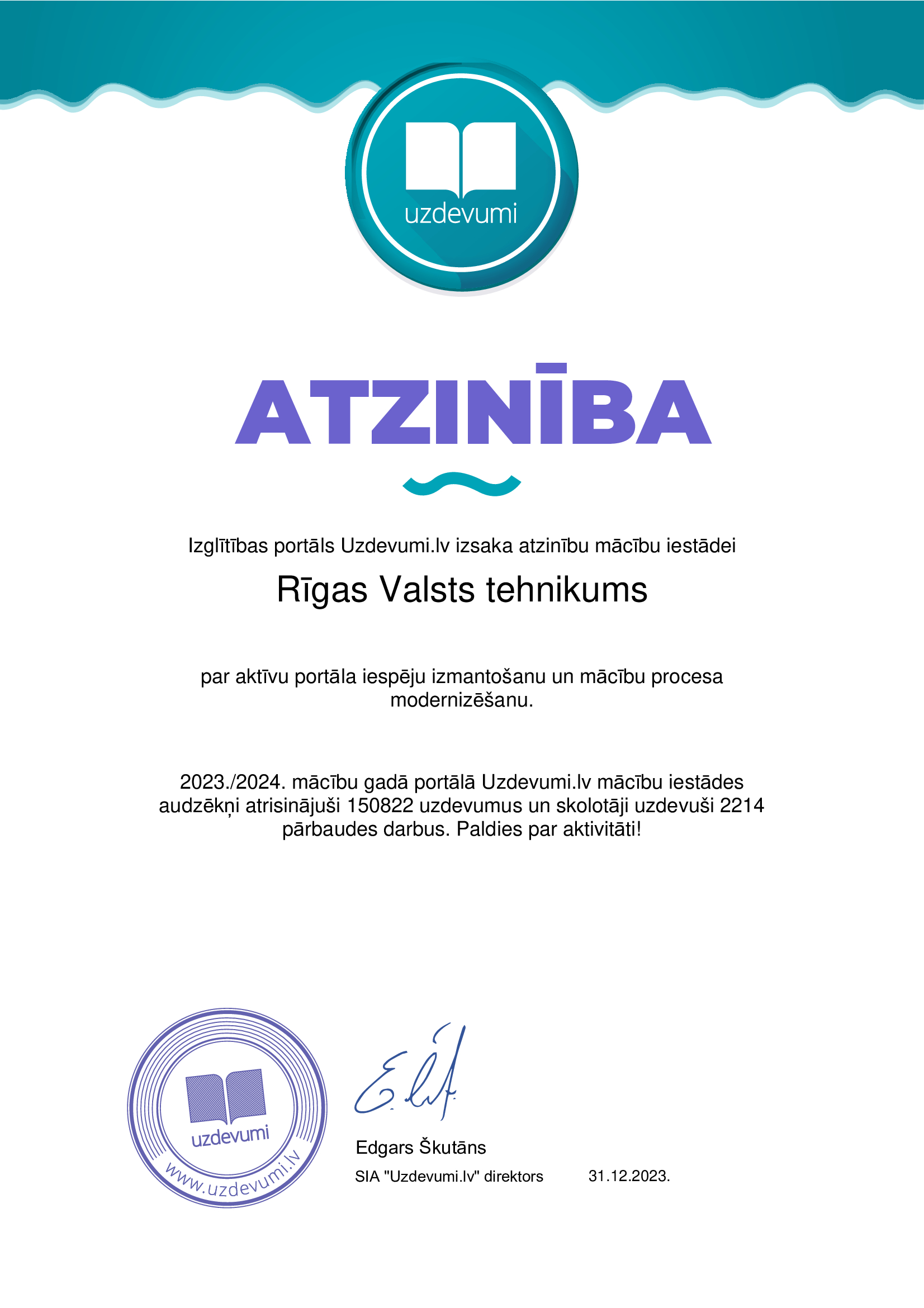 Rīgas Valsts tehnikums 2023./2024. mācību gada I semestrī ir bijusi viena no aktīvākajām izglītības iestādēm portālā Uzdevumi.lv! Paldies par skolotāju un skolēnu aktivitāti, sasniegtajiem rezultātiem!
