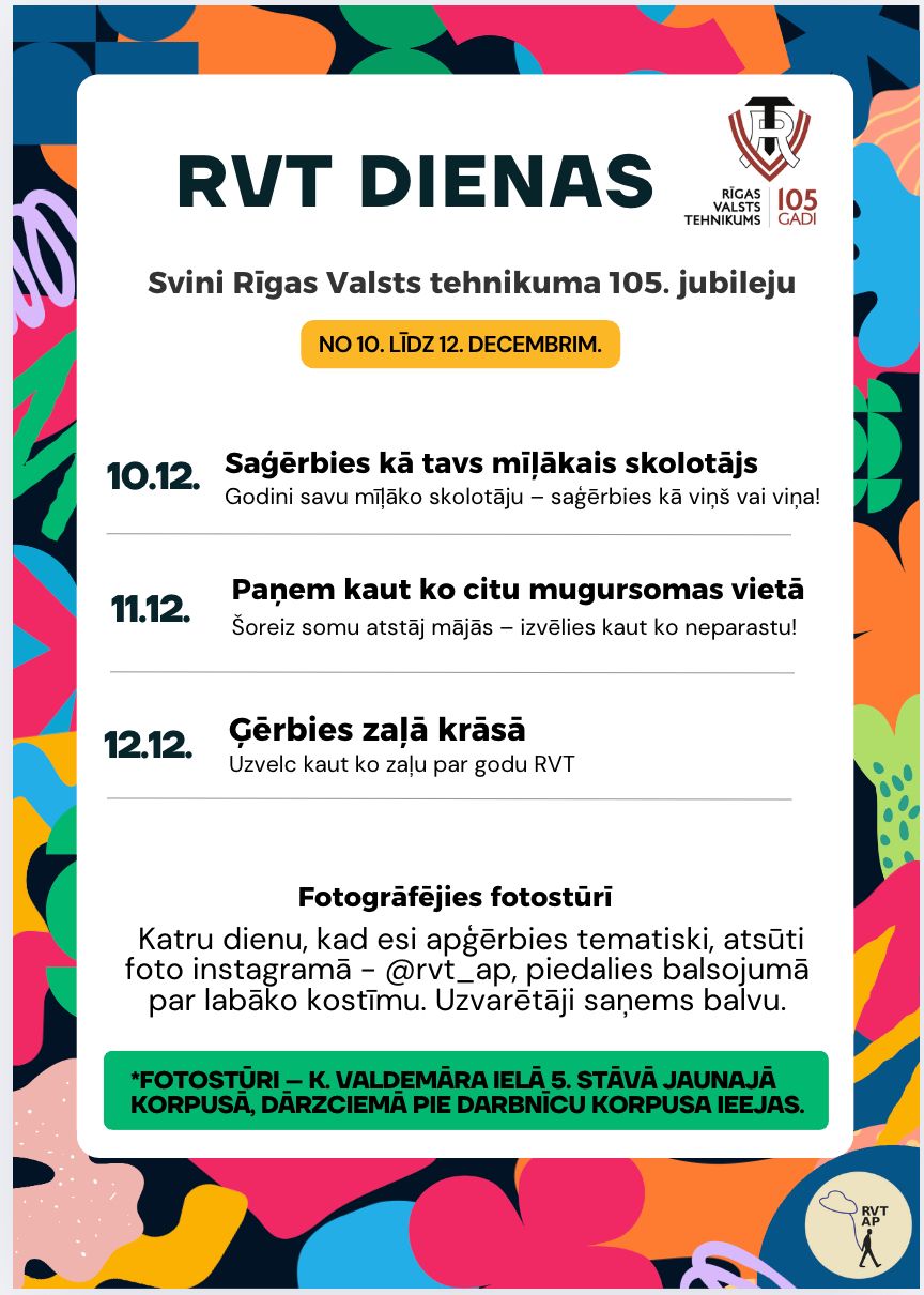 Katru dienu būs iespēja fotografēties K.Valdemāra ielas jaunā korpusa 5. Stāvā, vai Dārzciemā pie darbnīcu korpusa ieejas, un iesūtīt savas bildes Instagramā – @rvt_ap, kur arī varēs balsot par sev iemīļotu kostīmu. Katru dienu kostīms ar visvairāk balsojumiem tiks apbalvots!