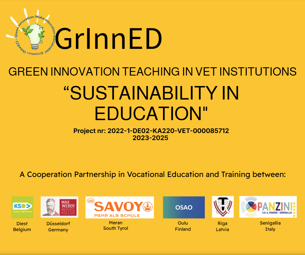 Erasmus+ projektā “GrInnED – Green innovation: Make education sustainable!”, No. 2022-1-DE02-KA220-VET-000085712, RVT skolotāji un audzēkņi kopīgi ar projekta partneriem izveidoja projekta mājas lapu un e-grāmatu par šādām projekta mācību tēmām: 1) aprites ekonomika, atbildīgs patēriņš un ražošana; 2) klimata pārmaiņu galvenie cēloņi un to radītās negatīvās sekas; 3) ilgtspējas jautājumi kultūras jomā; 4) zaļās inovācijas profesionālajās izglītības iestādēs; 5) reģionālais tūrisms; 6) rūpniecība, inovācijas un infrastruktūra.