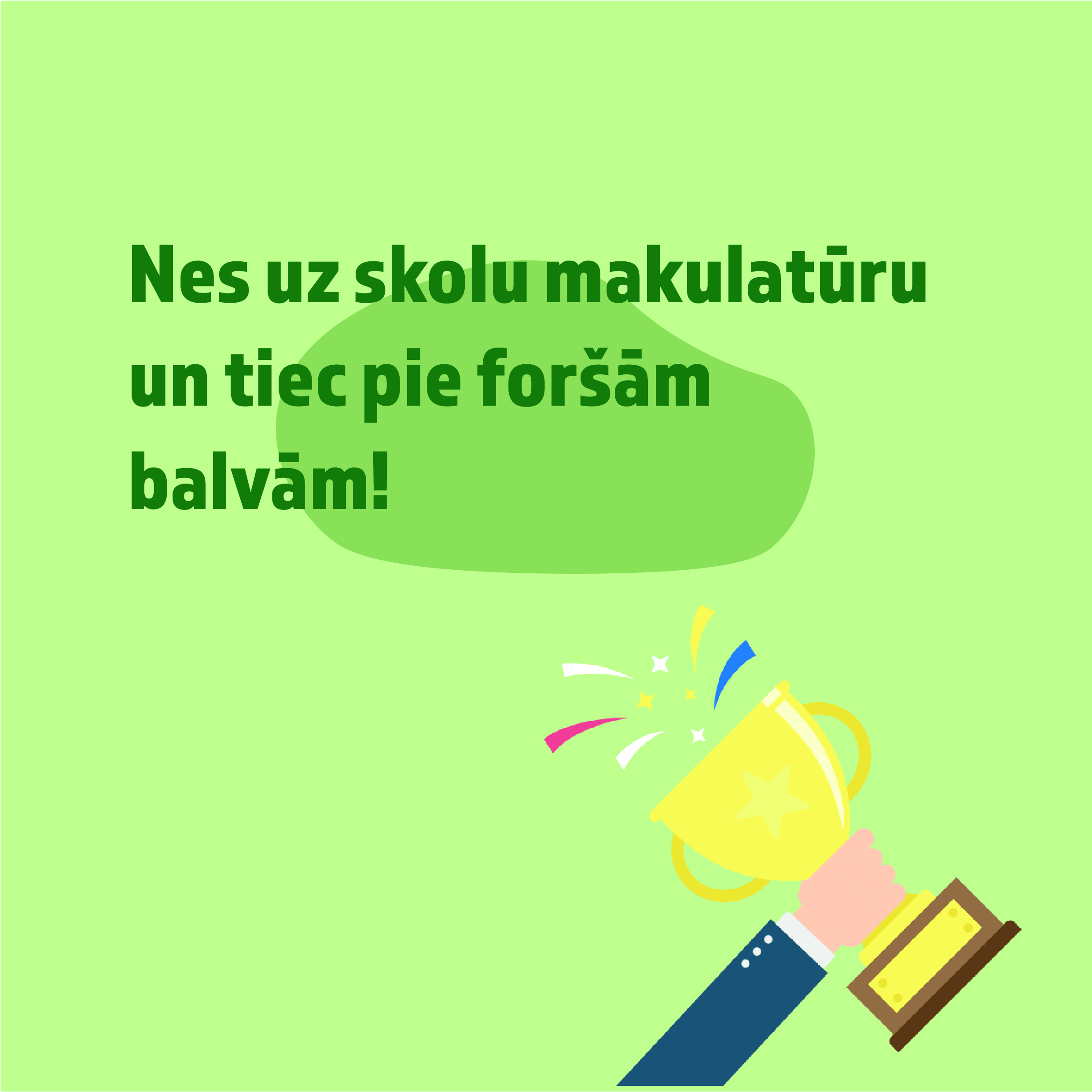 Esi aktīvs, uzrunā un iesaisti grupas biedrus, skolotājus, draugus, vecākus! Nodod makulatūru un tiecies izcīnīt tehnikuma lielo balvu! Balvas būs īpašas – tās neatstās vienaldzīgu nevienu! Sevišķi vērtīgas tās būs pirmo trīs vietu ieguvējiem! Taču šajā akcijā valda olimpiskais princips – balvas iegūs ikkatra grupa!
