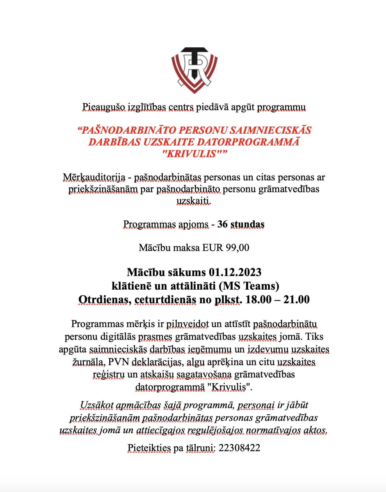 Iespēja apgūt datorprogrammu “KRIVULIS”