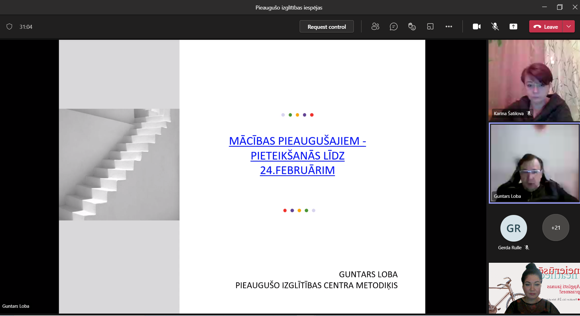 Lai informētu tehnikuma vecākus par iespējām, kuras sniedz iesaistīšanās pieaugušo izglītībā, karjeras konsultante Solveiga Keistere sadarbībā ar Pieaugušo izglītības centra Izglītības metodiķi Guntaru Lobu š.g. 16.februārī organizēja tiešsaistes informatīvu tikšanos. Sarunas laikā vecākiem bija iespēja saskatīt pieaugušo izglītības priekšrocības un personisko nozīmi, ieguvumus no tās sev un citiem, noskaidrot ārējos šķēršļus un barjeras, kas varētu apgrūtināt iesaistīšanos pieaugušo izglītībā. Izglītības metodiķis informēja tehnikuma vecākus par konkrētiem pieaugušo izglītības virzieniem un procesa priekšrocībām. Savukārt, karjeras konsultante aicināja vecākus būt par piemēru saviem bērniem, mācoties pašiem, radīt motivāciju jauniešos novērtēt mūžizglītības nozīmi.