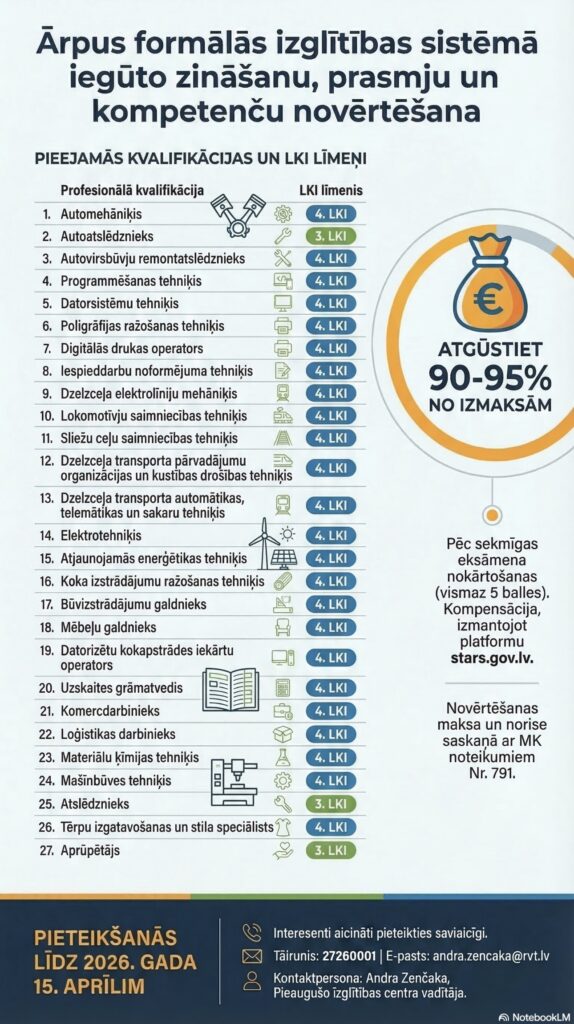 Ja darba tirgum nepieciešamās prasmes ir jau iegūtas darba vidē vai citur, ikvienam iedzīvotājam ir iespēja pieteikties ārpus formālās izglītības sistēmas apgūtās profesionālās kompetences novērtēšanai. ES fondi un valsts apmaksā 90% vai 100% apmērā.