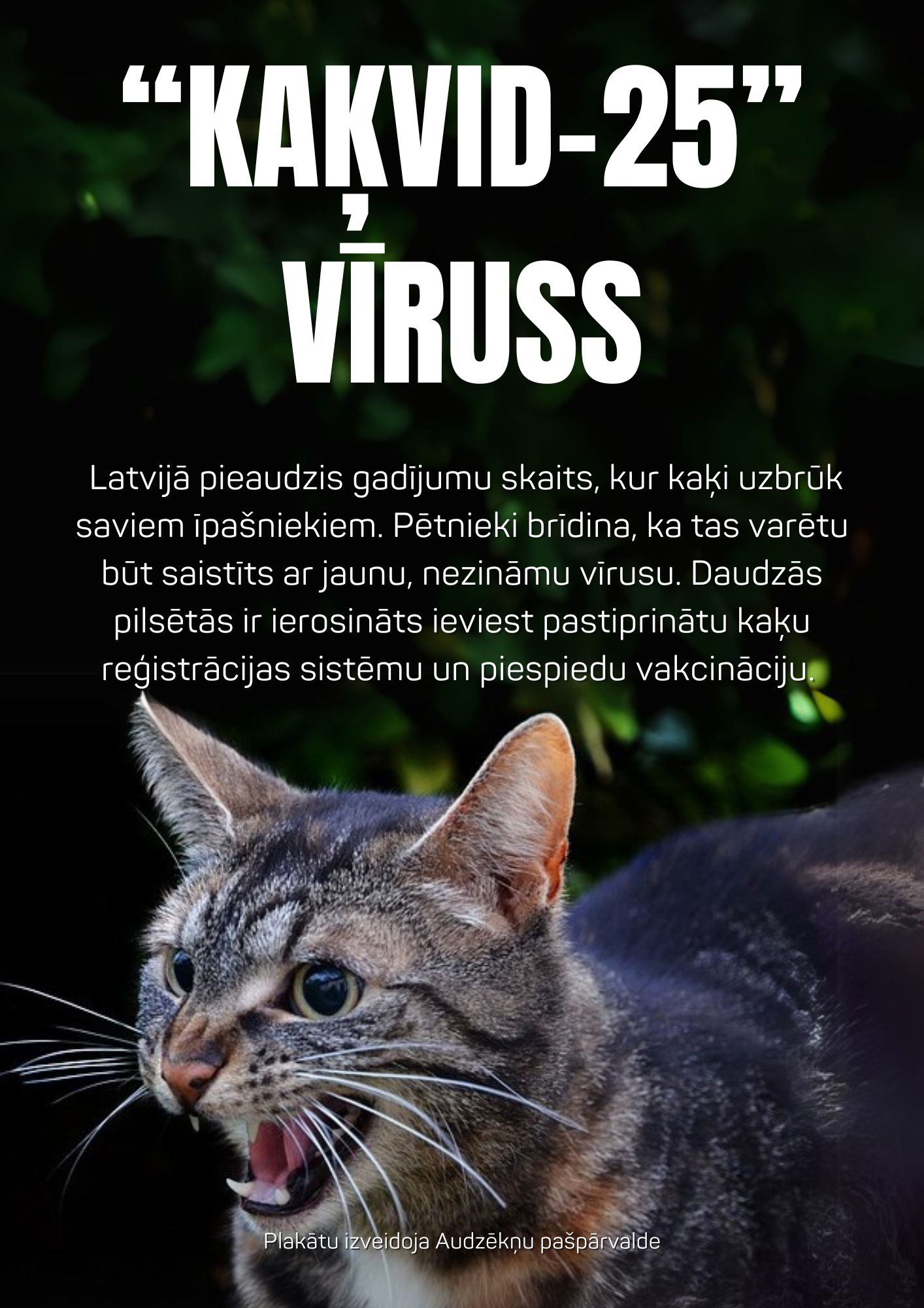 Sveiks! Vai tu dzirdēji par KAĶVID-2025?😼 -Tāda vīrusa nemaz nav. Tas bija neliels eksperiments – plakātā redzamā informācija bija viltus ziņa, lai tu uz brīdi apstātos un padomātu: Vai vienmēr var ticēt tam, ko redzam un lasām? 🤔