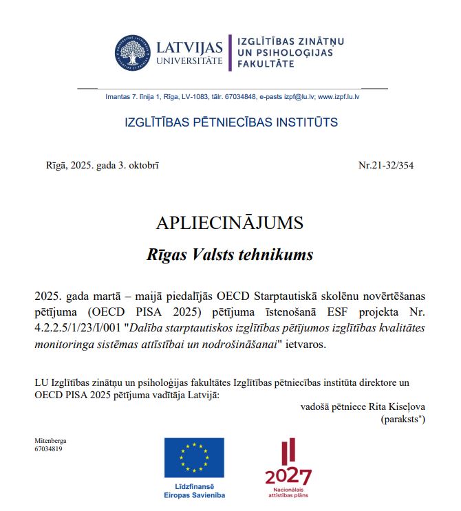 LU IZPF Izglītības pētniecības institūts OECD PISA 2025 pamatpētījuma komandas vārdā izteikusi pateicību Rīgas Valsts tehnikumam un īpaši koordinatorei Līgai Pauderei par atbalstu organizējot jauniešu dalību pētījumā. Pētījuma rezultātu paziņošana plānota šī gada septembrī.