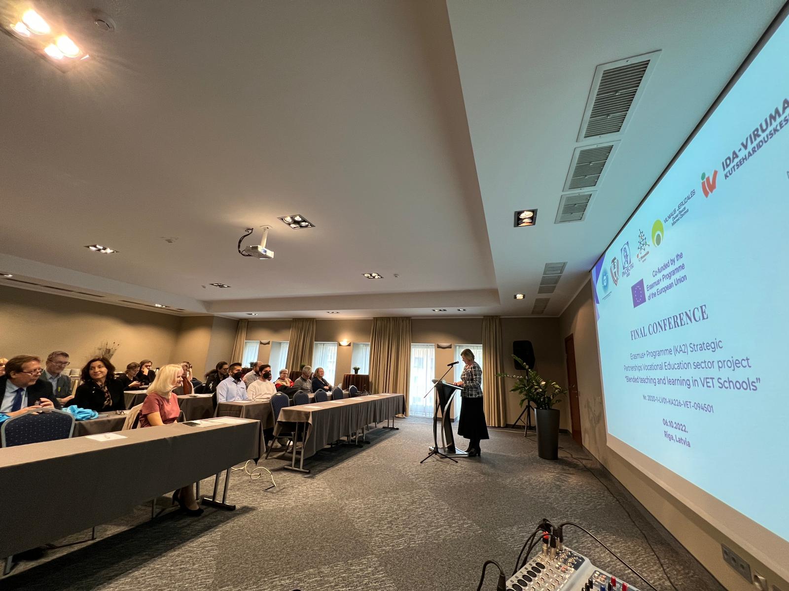 2022. gada 6. oktobrī notika Erasmus+ KA2 stratēģiskās partnerības projekta “Blended teaching and learning in VET schools”, Nr. 2020-1-LV01-KA226-VET-094501 noslēguma konference, kuru apmeklēja pedagogi no Latvijas, Slovēnijas, Grieķijas, Lietuvas, Igaunijas un Čehijas izglītības iestādēm. Konferenci svinīgi atklāja PIKC “Rīgas Valsts tehnikums” direktore Dagnija Vanaga. Par kombinētās mācīšanās būtību, projekta mērķiem, galvenajiem rezultātiem un kvalitatīva izglītības procesa grafisko modeli stāstīja projekta koordinatore Liena Ādamsone. Konferences laikā projekta speciāliste Anastasija Soloveičika iepazīstināja ar projekta mājas lapu un ar dažādajām virtuālajām laboratorijām. Giannis Graikos no Grieķijas pastāstīja par pedagogu un audzēkņu aptauju rezultātiem un Alenka Hmelak Gorenjak no Slovēnijas dalījās ar kombinētās mācīšanās veida izmantošanu mācību procesā. Konferencē tika arī praktiski izmantota ”Sešas domājošās cepures” metode, kuru vadīja PIKC “Rīgas Valsts tehnikums” pedagogs Laimrota Surska un “EdWordle”, kuru rādīja Tatjana Ševtšenko no Igaunijas.Lai iegūtuatgriezenisko saiti no konferences dalībniekiem, pedagogs Baiba Purlica izmantoja Mentimeter digitālo rīku konferences noslēgumā.