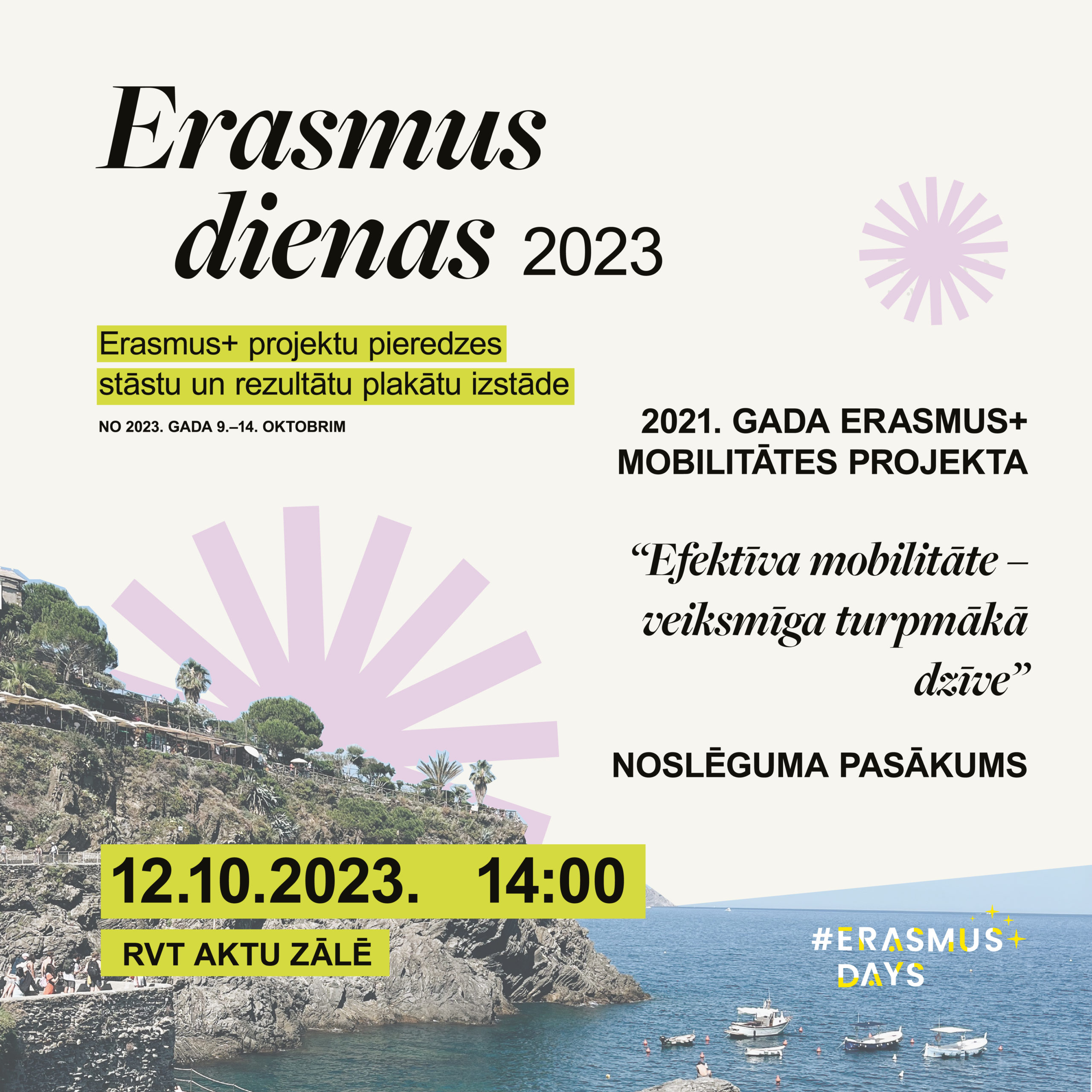 No 9. līdz 14. oktobrim Rīgas Valsts tehikums ar pasākumiem klātienē un publikācijām sociālajos tīklos atzīmē “Erasmus dienas 2023”. Šogad, atzīmējot Eiropas Prasmju gadu, Erasmus dienas iezīmē tēmu “6 dienas, lai Eiropa iemirdzētos!”. Šajās sešās dienās Erasmus+ projektu īstenotāji un profesionāļu tīkli no visiem izglītības un jaunatnes sektoriem rīko Eiropas mobilitātes svētkus un organizē dažādus pasākumus, daloties ar ieguvumiem no mobilitātes, Erasmus+ projektu rezultātiem un pieredzes stāstiem.